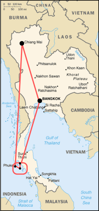 Paris ✈ Bangkok ✈ Chiang Mai ✈ Phuket → Koh Phi Phi (ferry) → Ao Nang / Krabi (ferry) ✈ Bangkok ✈ Paris