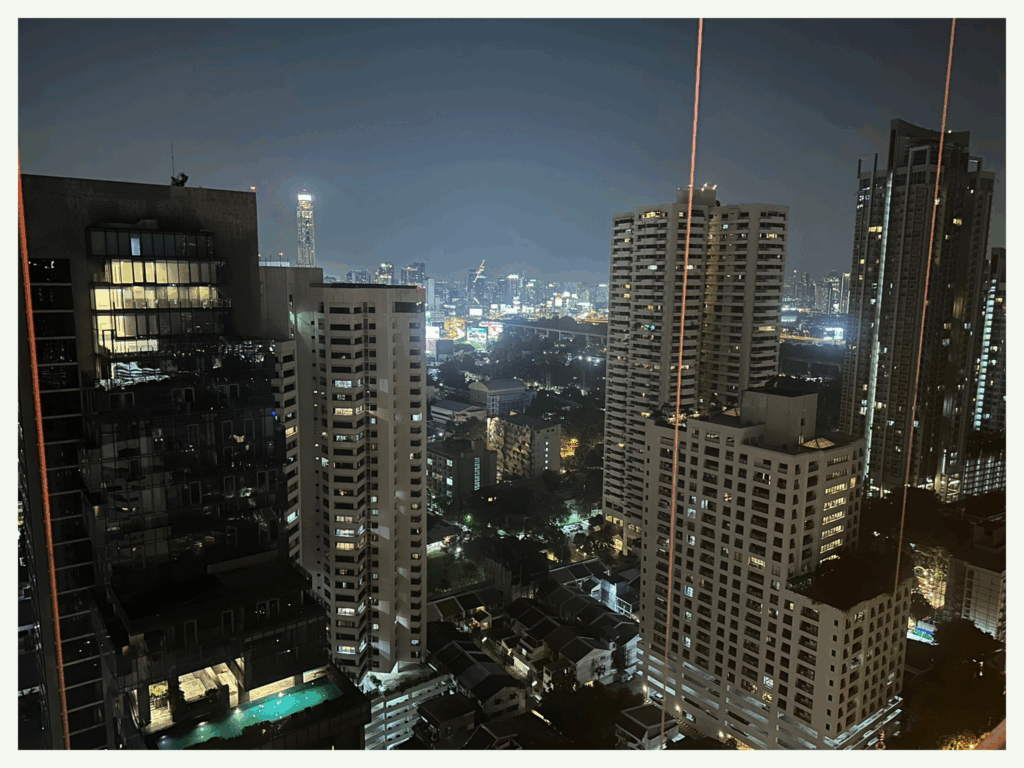 Après une petite sieste réparatrice, nous décidons de marquer le coup avec un rooftop (= toit aménagé en plein air) pour admirer le panorama nocturne de Bangkok (ou « skyline »). On choisit le Above Eleven3, un bar restaurant péruvien, perché en hauteur, avec une vue spectaculaire sur la ville. Ambiance chic mais détendue (« casual chic »), jolis cocktails, tapas délicieuses, et mention spéciale pour le guacamole préparé sous nos yeux (j’ai failli applaudir), un vrai régal. Nous avons réservé facilement en ligne, ce qui est vivement recommandé même si lors de notre passage, il n’y avait pas beaucoup de monde, rendant l’expérience d’autant plus agréable. Pour s’y rendre, on réserve un taxi via l’application Grab4 (le Uber local), très pratique et fiable. Et avant de partir petite pause photo oblige (comme celle-ci, juste en dessous) histoire d’immortaliser ce moment magique (ce n’est pas tous les jours que l’on voit autant d’immeubles de cette taille !).