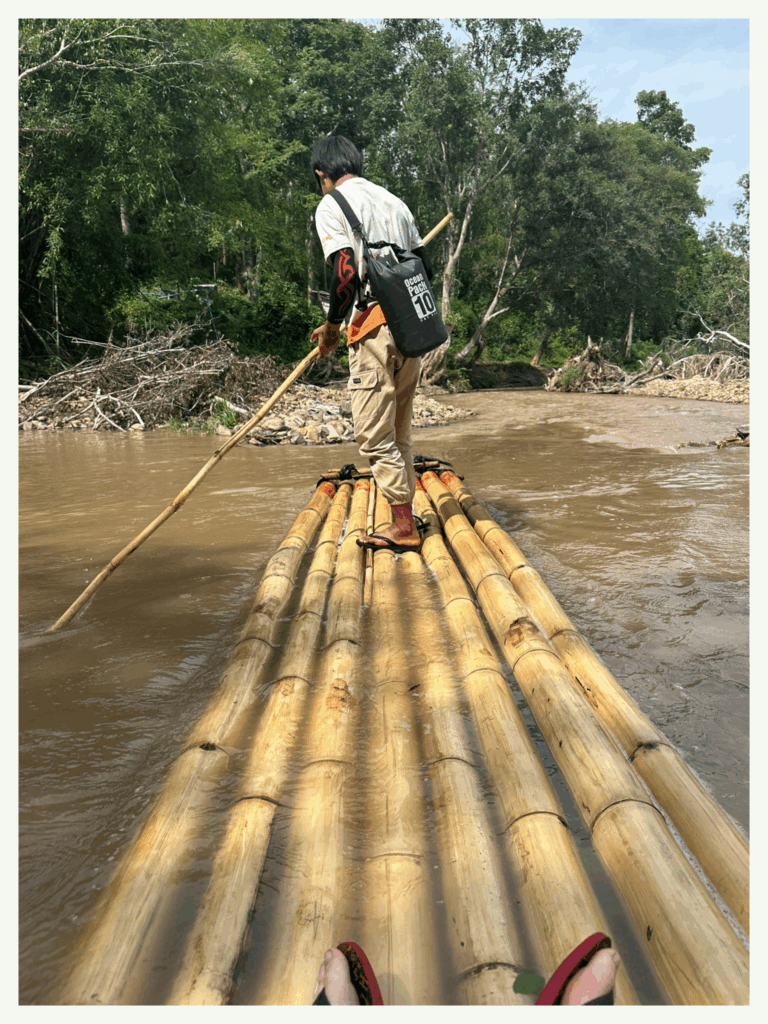 - Le rafting est une activité de plein air consistant à descendre des rivières en eaux vives à bord d’un radeau (ici, en bambou). ↩︎