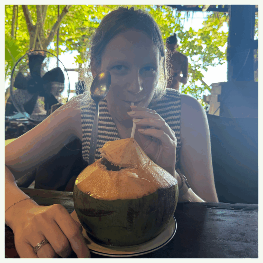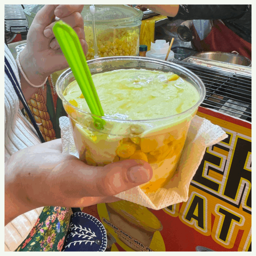 C’est là que nous faisons notre première dégustation de mangues : j’opte pour une mangue verte achetée au supermarché alors que Flora se laisse tenter par une mangue jaune fraîchement coupée par un vendeur ambulant. Résultat ? Grosse découverte : la mangue verte, croquante et acidulée, est bien loin des mangues sucrées que l’on connaît — à réserver aux amateurs de saveurs un peu piquantes (je vous avoue que pour ma part, j’ai été déçue…) ! Si vous cherchez quelque chose de plus doux, sucré et juteux, mieux vaut opter pour la mangue jaune. D’ailleurs, les vendeurs de rue sont non seulement très abordables, mais leurs fruits sont souvent bien meilleurs que ceux vendus en magasin, n’hésitez plus lors d’une envie de fruits frais !
